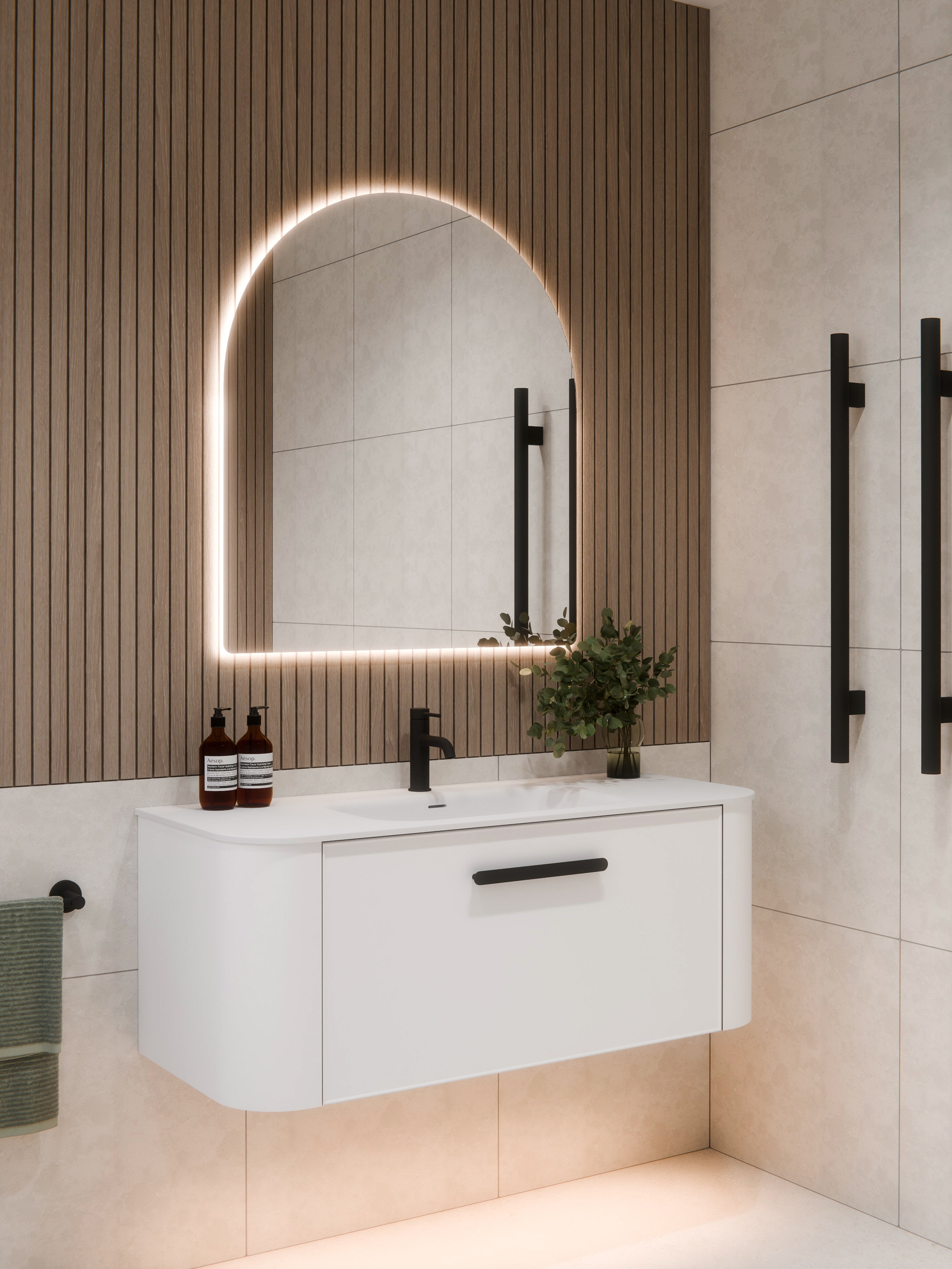 Elevate your bathroom with the modern Code Euro Arch Mirror, providing the ideal setting for a contemporary aesthetic. Enhance your bathroom's ambiance with our LED demister mirror, merging fashion and functionality with its soft backlit LED lighting. Find the perfect mirror to elevate your space with style and create the perfect atmosphere.